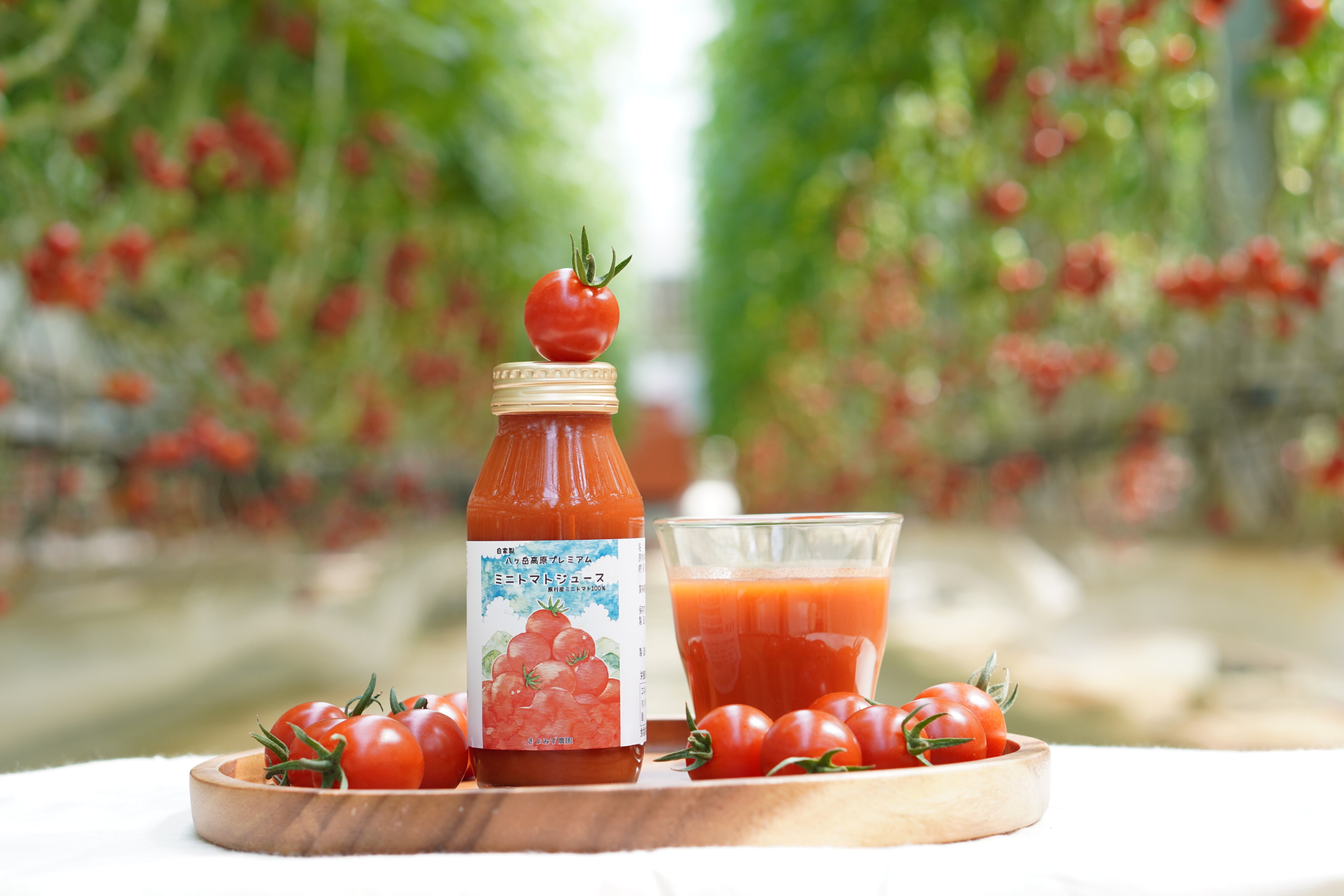 八ヶ岳高原産ミニトマトのみを使用したトマトジュースです。自家栽培の真っ赤に熟したミニトマトを一つ一つ下処理し、自前の加工所で丁寧にジュースにしました。ミニトマトの強い甘みと濃厚なコクが特徴のトマトジュースです。高原の豊かな自然の恵みをぜひご賞味ください。